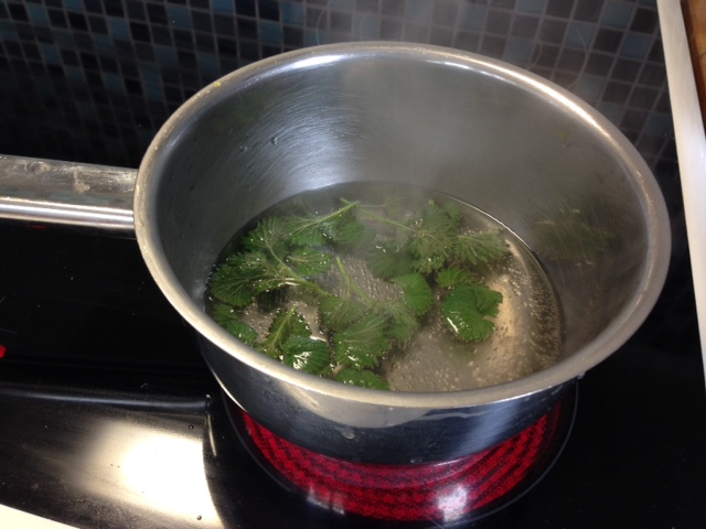 Jag vet att bästa tiden att plocka nässlor redan är förbi, men här behövs det inte så mycket, så det går bra med lite större blad också.