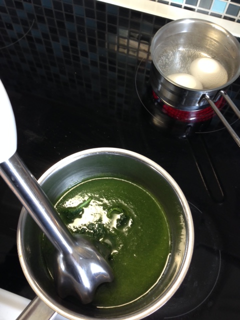 Och nu till själva knepet… Jag mixade ihop nässelbladen med vanlig spenatsoppa. Jag hade lite soppa över från middagen dagen innan, så det gick väldigt fort att göra klart soppan.