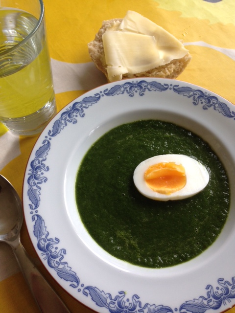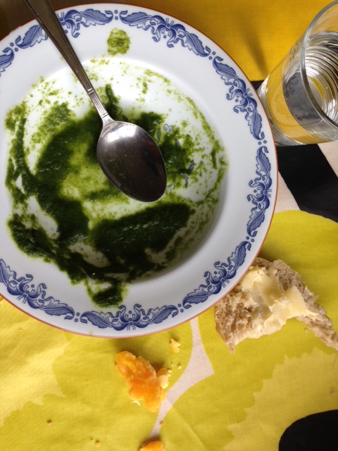 Och undrar ni hur jag gör spenatsoppan, så kokar jag ca 12 dl vatten, två grönsaksbuljongtärningar och ett paket fryst fryst hackad spenat (600 g). När det kokat en stund och spenaten tinat helt mixar jag det. Det är ingen idé att göra det lyxigt med grädde eller creme fraiche, då smakar det inte som på dagis. Alltså får det bli den här enkla varianten och det är faktiskt jättegott.