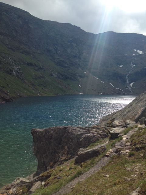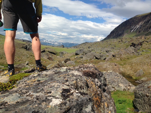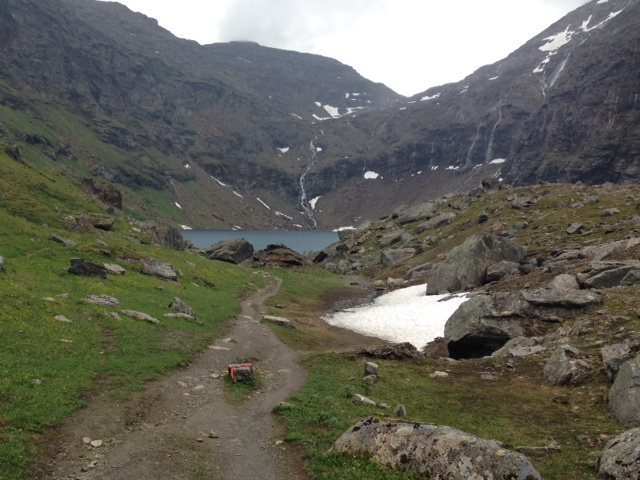 För de flesta av oss är det här en återvändsgränd och när man kommit till sjön vänder man och går tillbaka ut ur dalen. Men det finns de som går vidare på vänstra sidan på bilden (väldigt, väldigt brant uppför). Det finns till och med de som springer upp för fjällsluttningen! Dagen efter vi var här gick löpartävlingen Sweden Sky Race 24 för första gången. Tittar du noga ser du en röd snitsel på stenen på stigen som visar vägen för löparna. Man startar i Björkliden och springer ett eller två varv på en femmilarunda, höjdskillnaden är 3000 meter per varv. Löparna passerar jättefina ställen, så det är förstås härligt att springa och vilken utmaning! Det går även att orienterna i dalen. Just idag, 1 augusti, är det faktiskt en tävling här, den ingår i Lapplands femdagars. Min kusin och bloggkollega Jenny är där med sin familj och springer. Det är säkert jättekul!