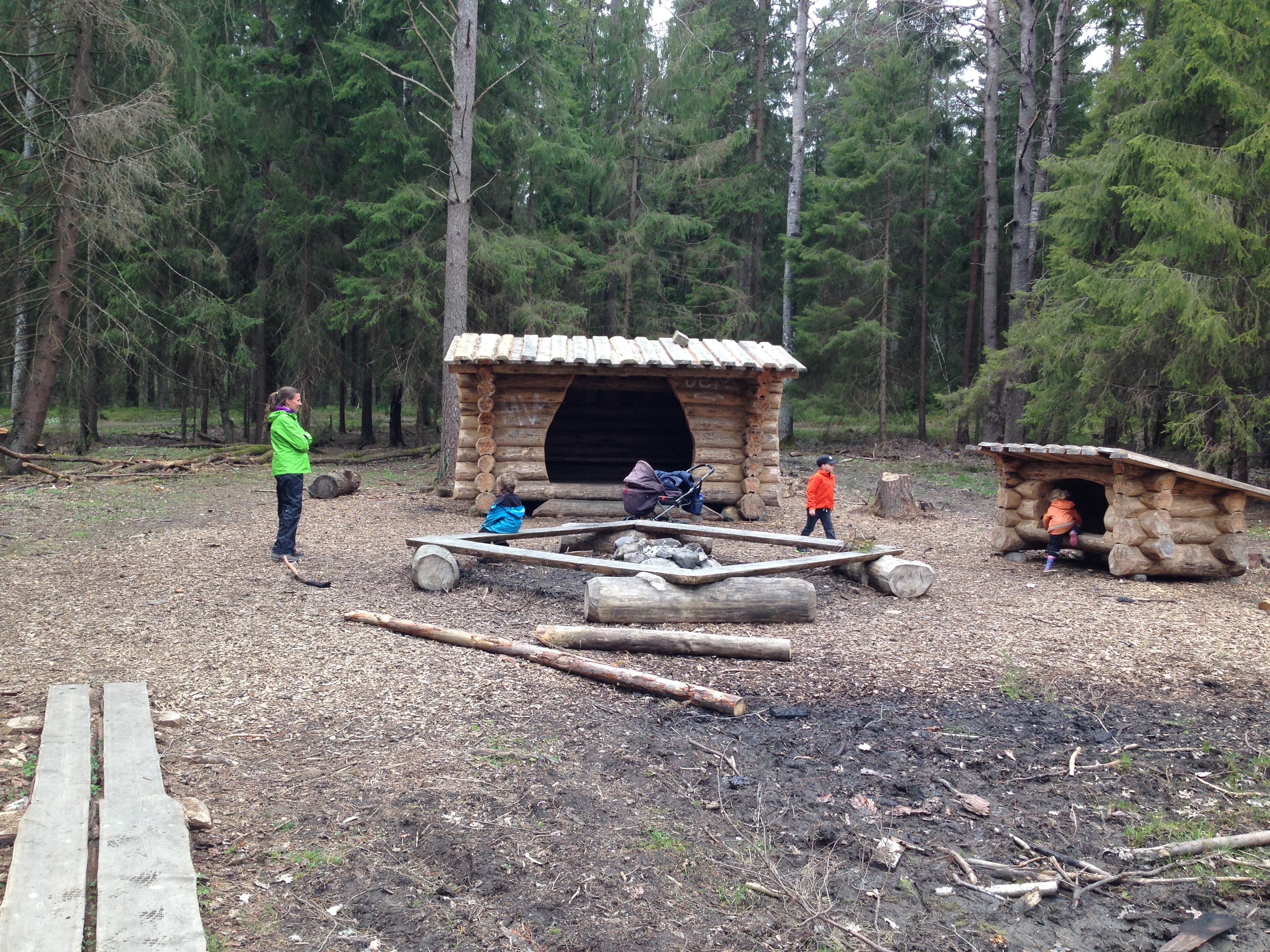 Förra gången vi åkte till Ensta hade vi med några kompisar. För att variera oss och inte bara vara på lekplatsen med barnen, tog vi med dem på en tur runt 1,25 km-spåret (blå markering). Då upptäckte vi en ny grillplats i skogen, precis vid spåret. Den var riktigt fin, med en rolig spång genom skogen och rejäla vindskydd. Spången börjar efter ca 400 m från starten på 1,25 km-spåret. Men missar du början på spången gör det inget, efter en stund går spåret precis bredvid vindskydden och eldstaden.