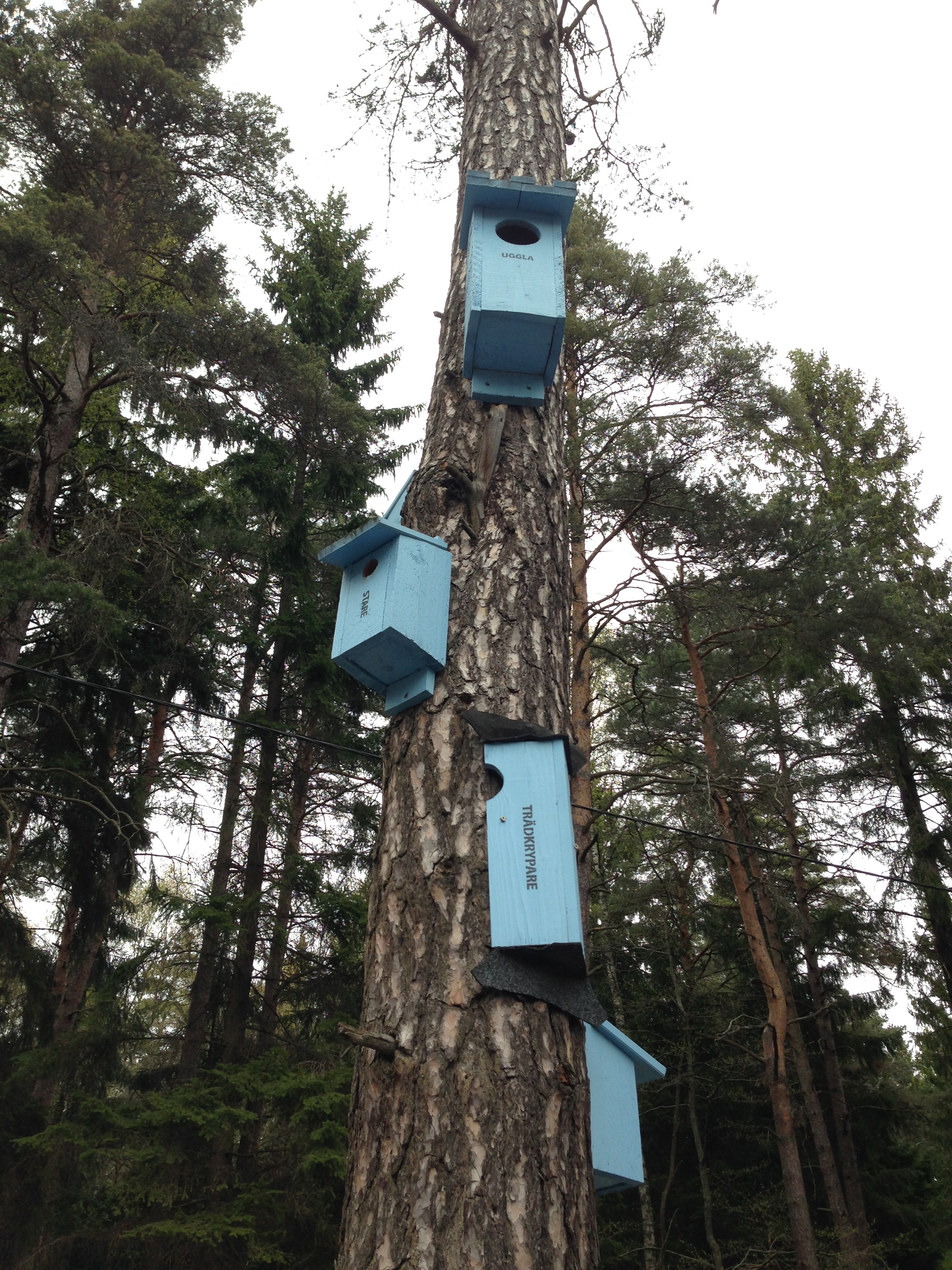 På lekplatsen finns bl a roliga löparbanor, klätterställningar, balansstockar och fågelholkar för olika sorters fåglar, till och med fladdermöss har fått en egen holk.
