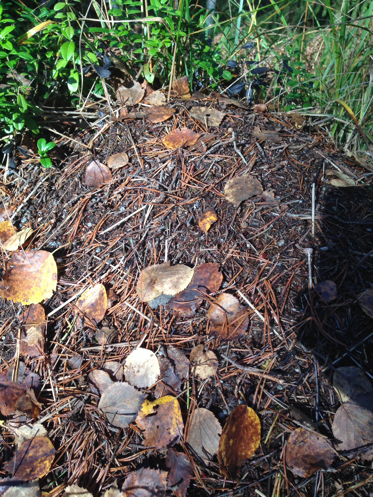 Vi funderar över myrornas vinterplaner vid en myrstack i höstsolen.